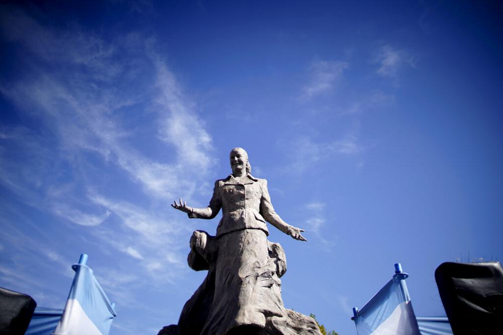 In this small town named for a cluster of "toldos" or rustic indigenous homes, Evita has become a legend. A large image of the combative first lady welcomes visitors along the town's main road, shared by cars, bikes and stray dogs. Downtown, a statue of the charismatic woman with her arms spread wide pays tribute to one of her popular speeches as the co-leader of Peronism.