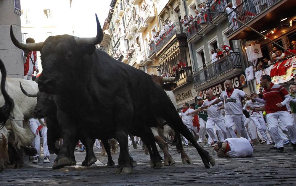 Thursday's run was preceded by a protest by a small number of the "runners," who sat on the street before the bulls were released. They consider that this year's bull runs have lacked the usual excitement because the bulls have largely stayed behind the large steers which quickly guide them through the narrow, twisting streets to Pamplona's bullring, where the bulls will be killed in bullfights later in the day.