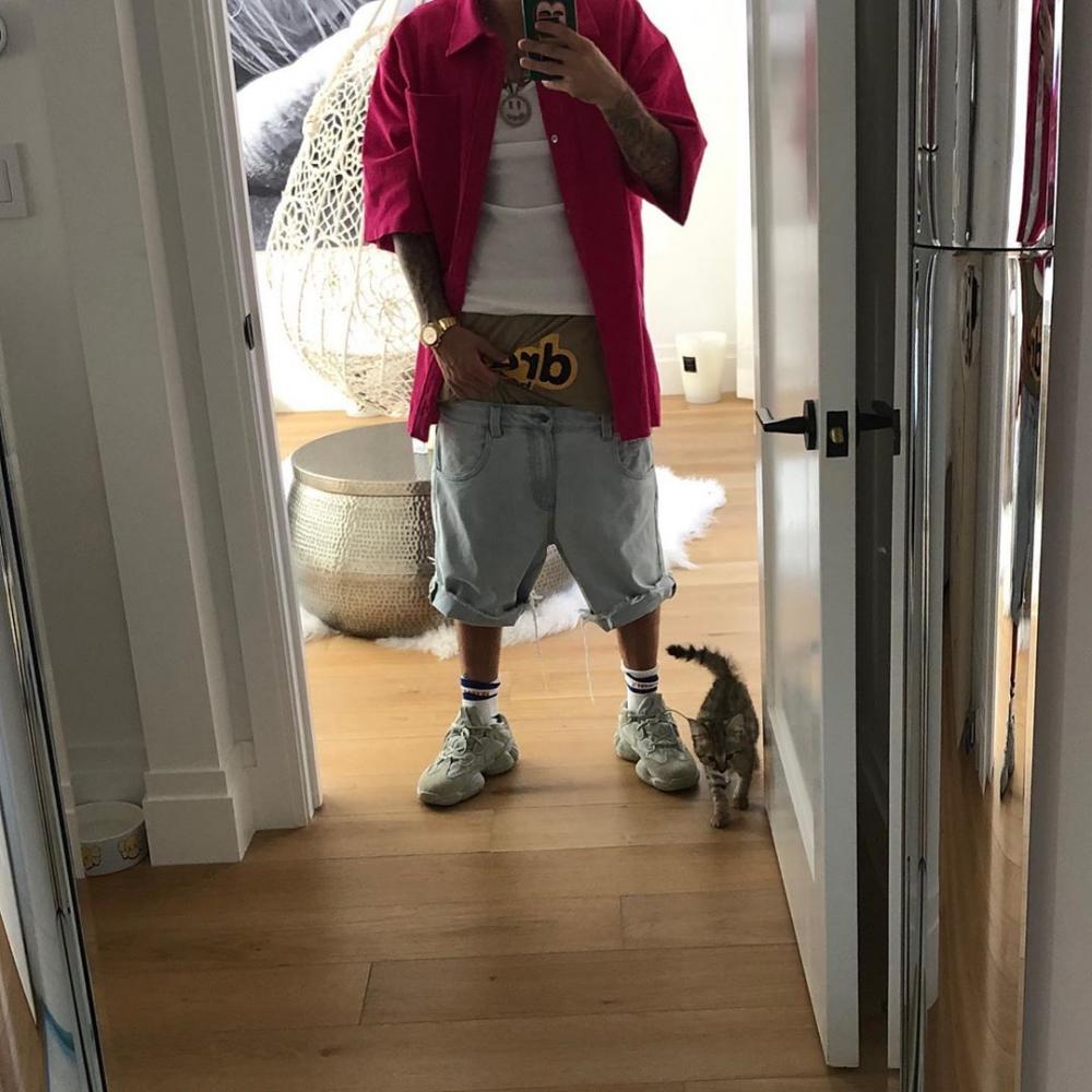 But it's his latest Instagram post that has some heads turning. Captioning the snap with a number of flame emojis, the pic shows Bieber wearing a fuchsia button up over a tank top. His jean shorts are riding low and exposing his underwear and Bieber is seen grabbing his...junk. Oh and Sushi is standing next to him.