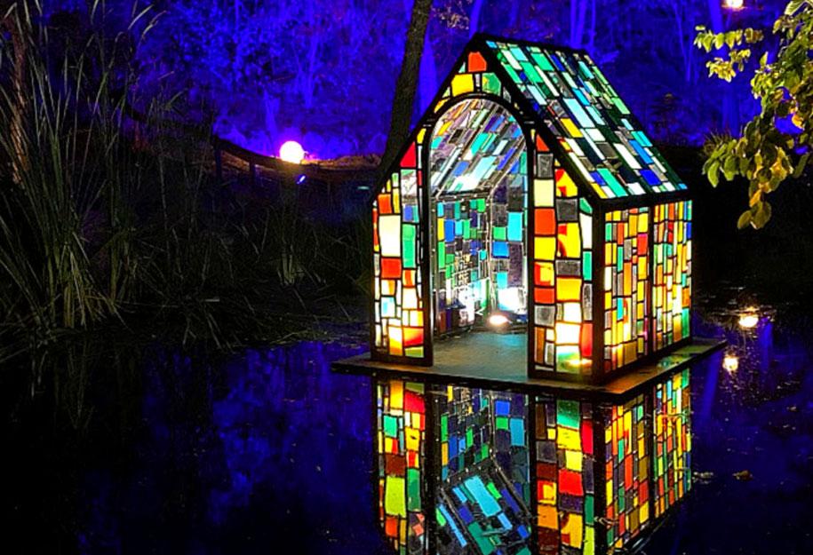 Upon entering the grounds, you will encounter Flower Power, a large bed of lighted tulips in a variety of transforming colors. The flowers put on their own show, changing from hue to hue in a synchronized pattern. Beyond this you will find the Celestial Shadows by HYBYCOZO, a display of spinning installations that hang from the trees and allow you to explore geometry through light and shadow. Take a moment here to admire the Camouflage House by contemporary sculptor Tom Fruin, which graces Descanso's Mulberry Pond.