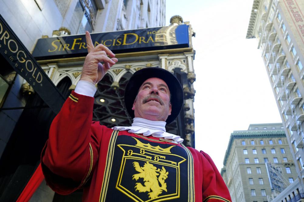 The 1928 hotel, named for the Elizabethan-era English explorer, has the costumes for its doormen custom-made. Sweeney's latest gold- and black-trimmed suit cost $3,000 and weighs about 40 pounds (18 kilograms).