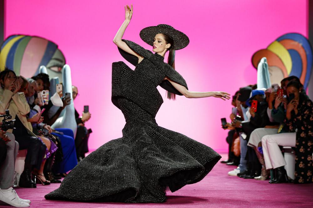 Column gowns came in "Joker" Jacquard and multicolored "Harley" fringe. Among Siriano's finale looks were architectural mermaid gowns in a sparkly silver crystal and black print with boxy waists, worn with wide-brim hats. There was ample black, and velvets in blush and fuchsia. He also put out gowns, cropped blazers and flare trousers in eggplant.