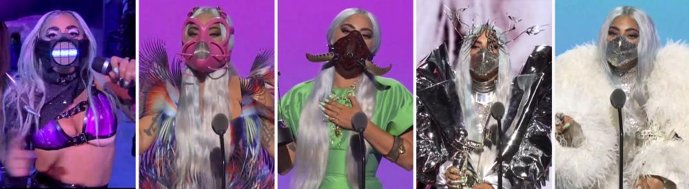 Gaga donned a pink mask that strapped around head, a mask with pointy tusks and even an electronic display on a mask while she sang "Rain on Me" with Grande, who also sported her own black mask. She held the award for artist of the year wearing a white tulle and organdy coat by Valentino and a matching silver mask.