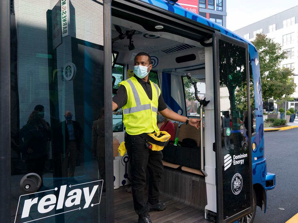 State and local officials debuted the Relay system Thursday, an all-electric, autonomous vehicle that will provide free shuttle rides back and forth from the Dunn Loring Metrorail stop to the bustling Mosaic District in Fairfax County.