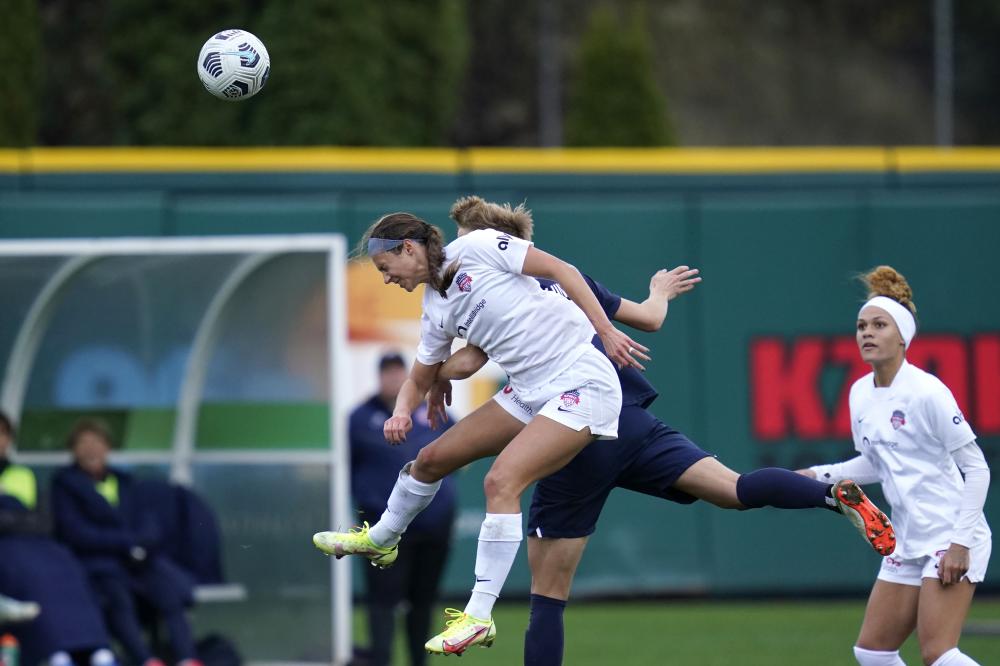 Washington Spirit forward Ashley Hatch, left, heads the ball in front of OL Reign midfielder Quinn in the second half in the semifinals of the NWSL soccer playoffs Sunday, Nov. 14, 2021, in Tacoma, Wash.  (Source:AP Photo/Elaine Thompson)