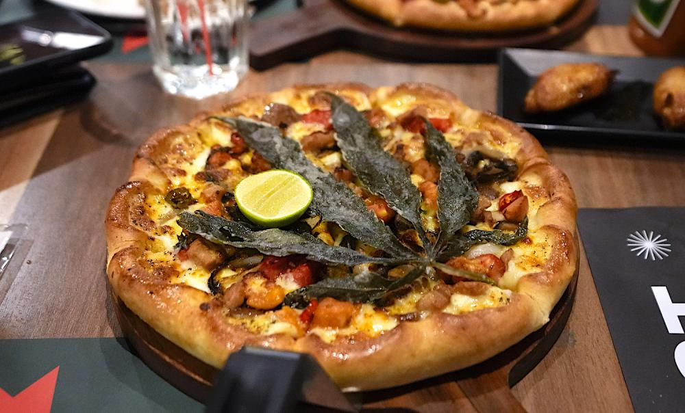 The Crazy Happy Pizza is a mashup of toppings evoking the flavors of Thailand's famous Tom Yum Gai soup along with a deep-fried cannabis leaf on top. Cannabis is also infused into the cheese crust and there's chopped cannabis in the dipping sauce. A 9-inch pie costs 499 baht (about $15). Customers preferring a do-it-yourself variety can choose their own toppings, with a 100 baht ($3) surcharge for two or three cannabis leaves.