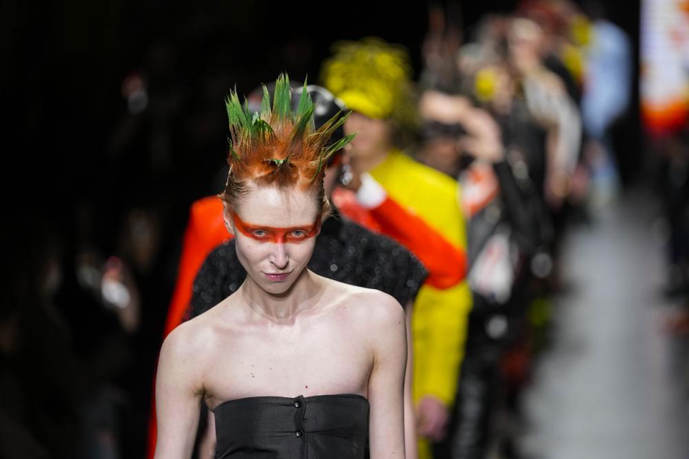 The models themselves each wore a creation by creative director Francesco Rizzo, but also an object from their own wardrobe, part of Rizzo's growing collaboration with a community around the brand that he calls collaborators. Elaborate head-dressings, including teddy bears sticking out of knit caps, twisted felt and wool, or wire devils ears, gave a sort of zombie menace to the slow, irregular procession.