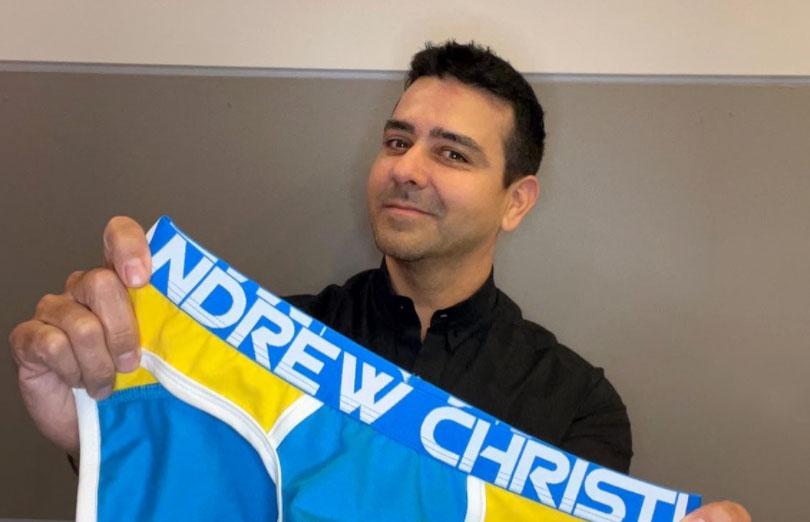 Underwear maven Andrew Christian posed with a pair of briefs in the blue and yellow colors of the Ukrainian flag on social media last Wednesday.