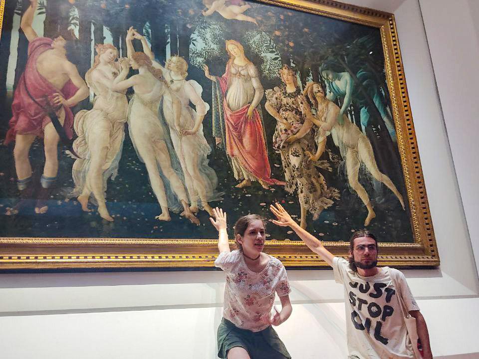 Italian environmental activists glued their hands Friday to the glass protecting Sandro Botticelli's painting "Spring" in the Uffizi Galleries in Florence, police said. The museum said thanks to the glass, which was installed as a precaution several years ago, the masterpiece was unharmed.