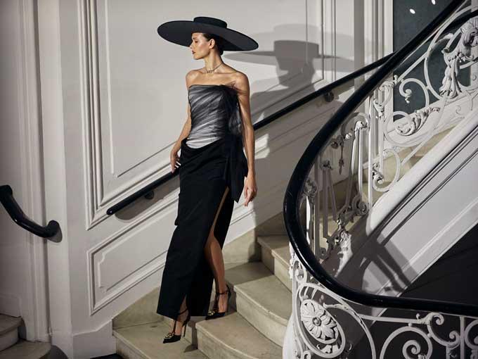 Ultra-wide brim hats stole the show in black, royal blue and bright red. There was plenty of sparkle, and an asymmetrical set of huge tiered ruffle bell sleeves on one high-neck evening dress in white. One sleeve started at the shoulder and the other at the elbow.