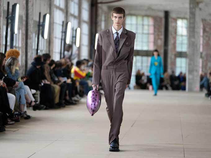 Distressed double denim continued the underwater vibe on one male model who plodded down the runway with a blue knitted mask over his entire face, and transparent globules over his hands. It made him look as if he had been attacked by a jellyfish. Or Rushemy Botter and Lisi Herrebrugh's show may have been another dig at the coronavirus pandemic.