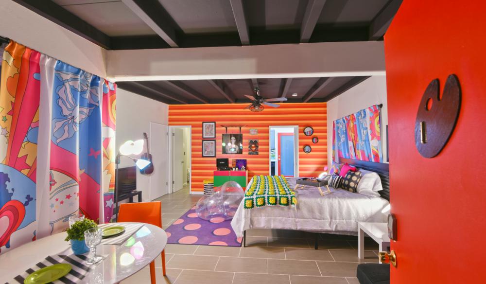 Lovers of color and culture will be hard-pressed to find more of them in one place than The Art Hotel, a complete 2020 renovation (by husband and wife team Jerry and Tracy Turco) of the former Sandalwood Hotel, a mid-century property from 1960 located on the north end of Indian Canyon Drive. As its name suggests, the property is filled with visual art — much of it by local artists — and each of the eight rooms comes with rare perks for music aficionados including a guitar, a vintage record player, and a curated vinyl collection. An outdoor mural by New York City street artist Damon Johnson has become a popular Instagram backdrop. For small groups of up to 15, the property is also perfect for full buyouts.