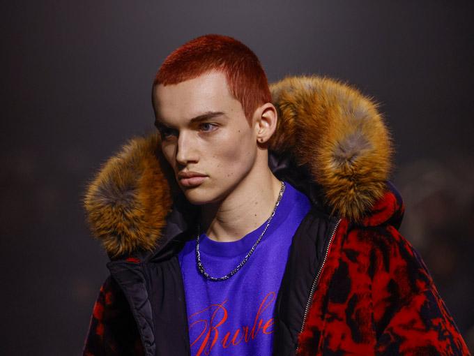 Male models wore low-slung, baggy trousers worn with skin-tight polo neck tops, and silver chains and hardware, paired with a red and black palette, hinted at a punk-inspired aesthetic. But there were humorous touches, too, such as a woolly trapper hat topped with a knitted duck head.