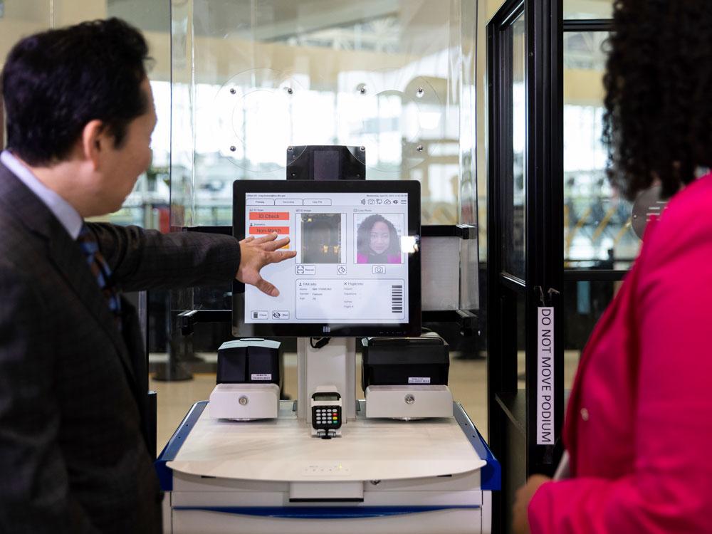 A passenger walks up to an airport security checkpoint, slips an ID card into a slot and looks into a camera atop a small screen. The screen flashes "Photo Complete" and the person walks through — all without having to hand over their identification to the TSA officer sitting behind the screen.
