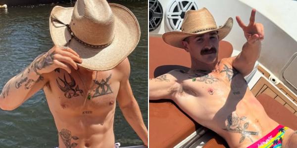 As modeled here by thirst trapper "Boy It's Nick," we see that the unique, eye-catching swimwear, from the brand Wayne Underwear, has string ties that are strong enough to hold your sunglasses and may be the only swimsuit Nick could have worn that competes with the striking, stunning look of his tattoos and nipple piercings. We'll give this sexy snakeskin print a hot 10/10 to match the model's buttcheek tattoo.