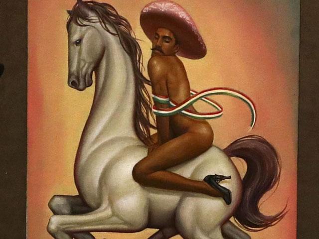 The painting depicts a nude Zapata wearing high heels and a pink, broad-brimmed hat, straddling a horse.