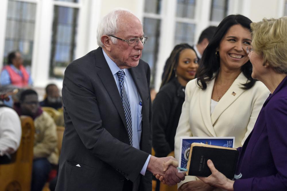 "This is THE handshake," presidential contender Tulsi Gabbard said as Sanders and Warren reached across her to shake hands in the front row. They and rival Amy Klobuchar attended the service before they joined Joe Biden, Pete Buttigieg and other contenders in the march to the Statehouse.