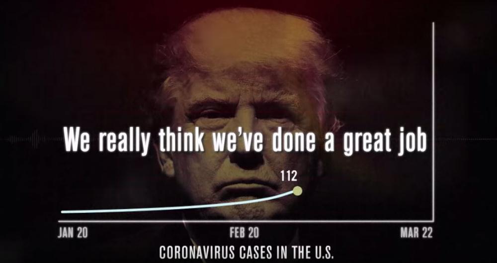The ad strings together audio of recent comments by Trump in which he attempts to minimize the seriousness of the coronavirus outbreak, including a snippet in which he says, "This is their new hoax."