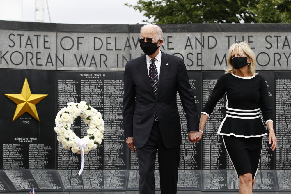 But Biden briefly greeted a county official and another man, both wearing face masks and standing a few feet away. Biden also yelled to another, larger group standing nearby, "Thank you for your service." His campaign says Biden has gone to the park for Memorial Day often in the past, though services were canceled Monday in the pandemic.
