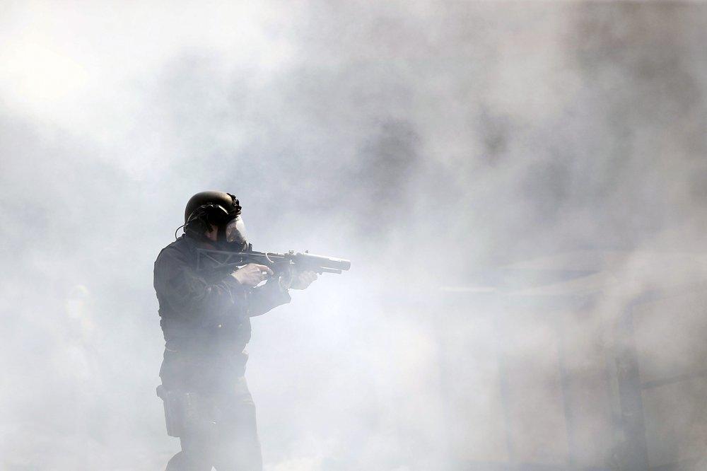Footage shown on TV as captured by local reporters shows a group of police officers in riot gear and gas masks surround a car being driven by a man with a woman in the passenger seat. The officers pull the woman out and appear to use a stun gun on the man. They use zip-tie handcuffs on the woman on the ground.