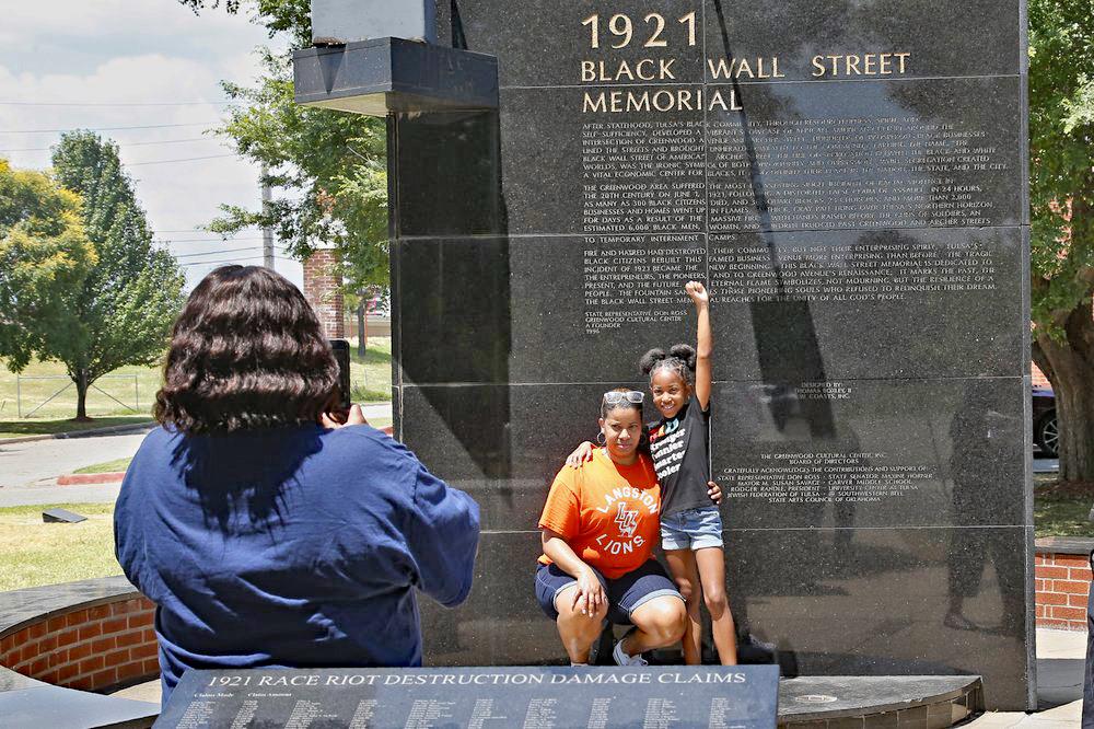 Despite the Oklahoma heat, visitors of all races drive up to the site of the destroyed black community. They take photos of themselves in front of the inscribed memorials to what's now called Black Wall Street. They raise a defiant fist in the air for other photos in front of a mural to Black Wall Street painted on the side of the overpass.