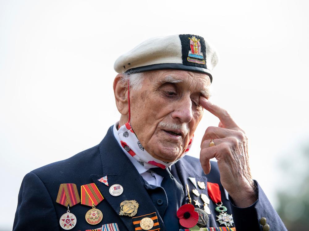 World War II veteran Seymour "Bill" Taylor, who turns 96 next month, usually attends the service but paid his respects outside his home in Colchester, around 65 miles (105 kilometers) northeast of London, with the support of his neighbors.