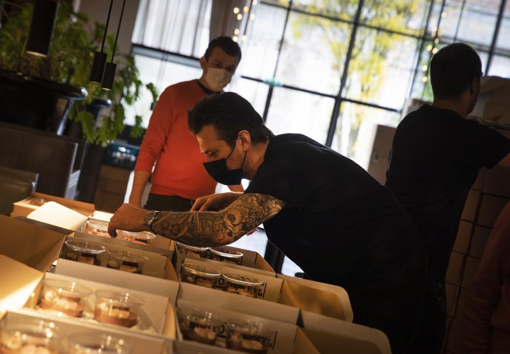 A frenetic energy emerged from its kitchen as his team was trying get around 600 dinner boxes ready by the next day. They held anything from turbot to sea buckthorn, from artichokes to Zeeland mussels.