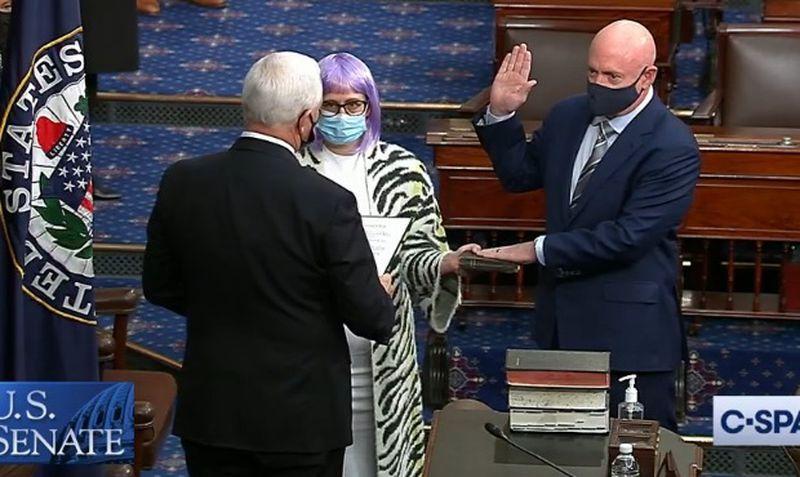 Sen. Krysten Sinema (D-Ariz.), resplendent in a purple wig and zebra striped shawl, stole the show at the swearing-in of new Democratic colleague Sen. Mark Kelly on Wednesday, New York Daily News reports.