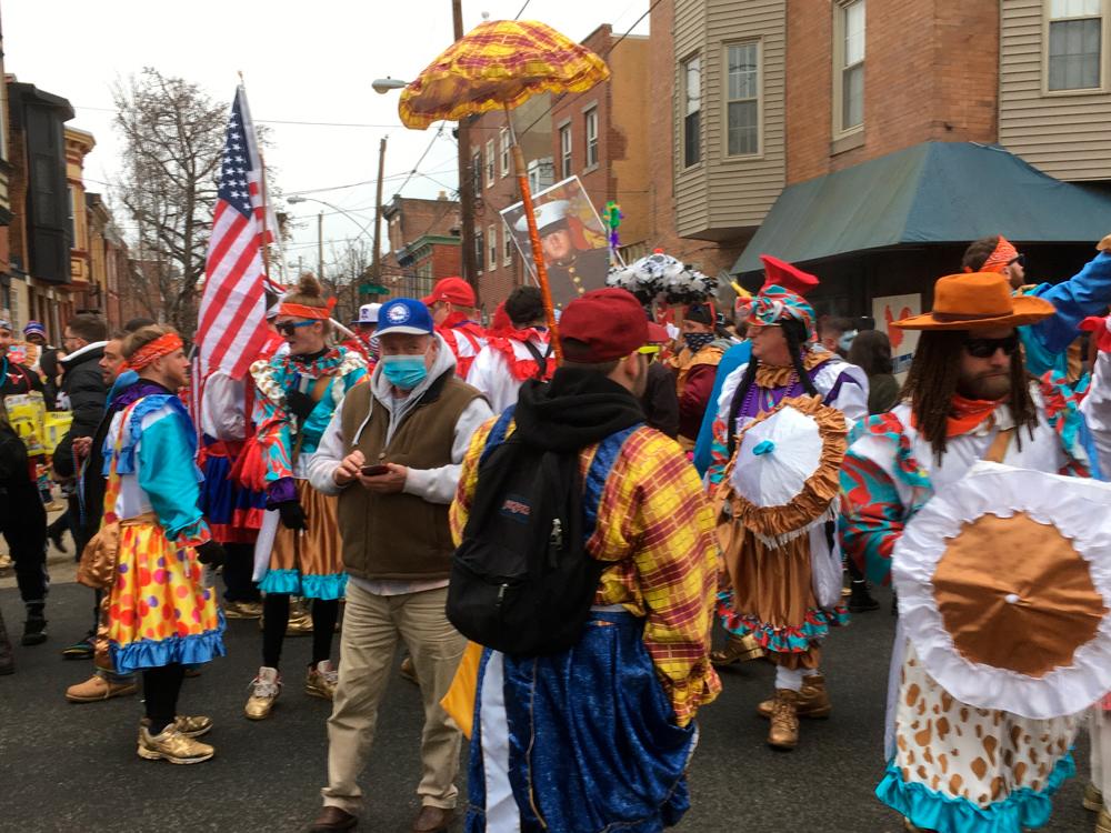 Participants in brightly colored costumes, some with faces painted, paraded Friday down 2nd Street in South Philadelphia following trucks that blared string band or popular music. Some wore masks but many did not, and others marched with them wearing "South Philly Still Struts" sweatshirts. WPVI-TV reported that other groups of Mummers marched through other sections of south Philadelphia.
