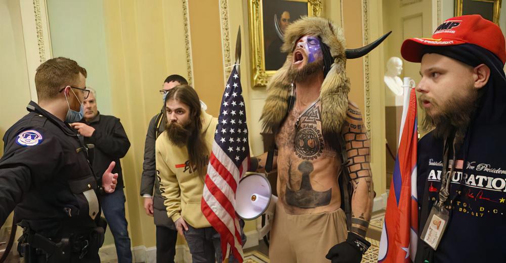 First there's the 'Q Shaman,' (aka Jake Angeli or Jake Chansley), "the insurrectionist, who was photographed sporting furs and a horned headdress during the attack, turned himself in after storming the Capitol, completely unafraid. 'Wasn't Jesus arrested?' he asked— while also comparing himself to Mahatma Gandhi and Martin Luther King."
