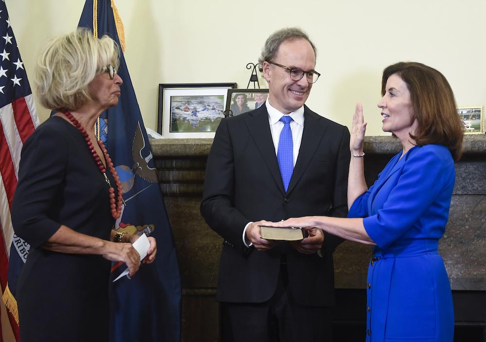 Hochul, her husband, Bill Hochul, and DiFiore entered the room wearing masks, taking them off when the ceremony began. Hochul placed her hand on a bible held by her smiling husband, a former federal prosecutor and current general counsel for Buffalo-based food service and hospitality company Delaware North.