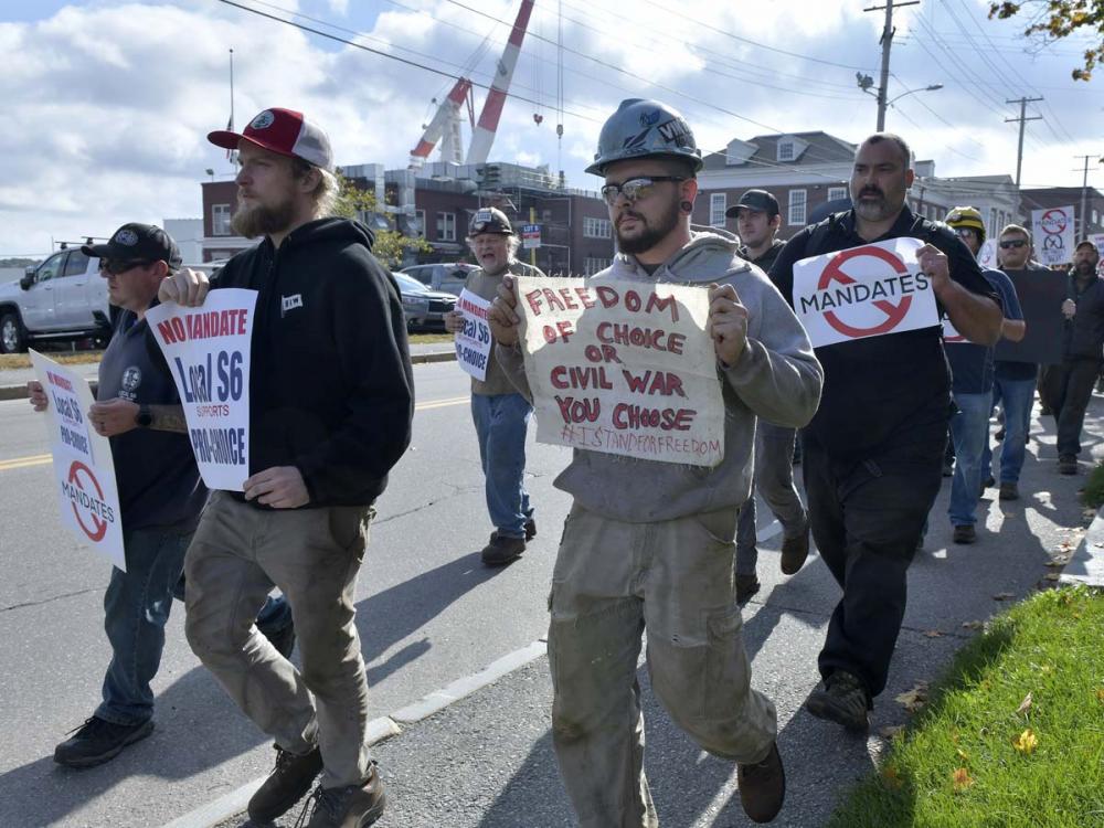 On Friday, some 100 shipbuilders gathered outside the shipyard during their lunch break to protest being forced to get vaccinated. They marched down the street, holding signs decrying the mandate and using choice four-letter words that made clear what they think of the president and his vaccine mandates.