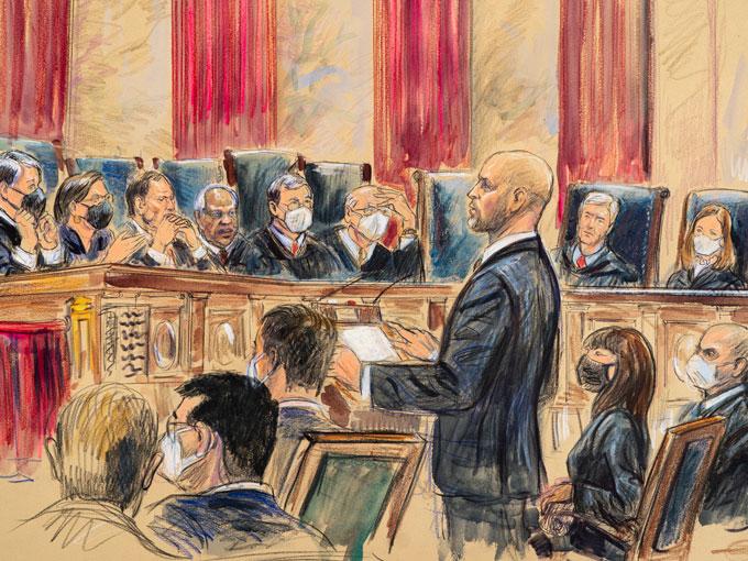 The courthouse remains closed to the public, and lawyers and reporters are asked for negative test results before being allowed inside the courtroom for arguments, though vaccinations are not required.