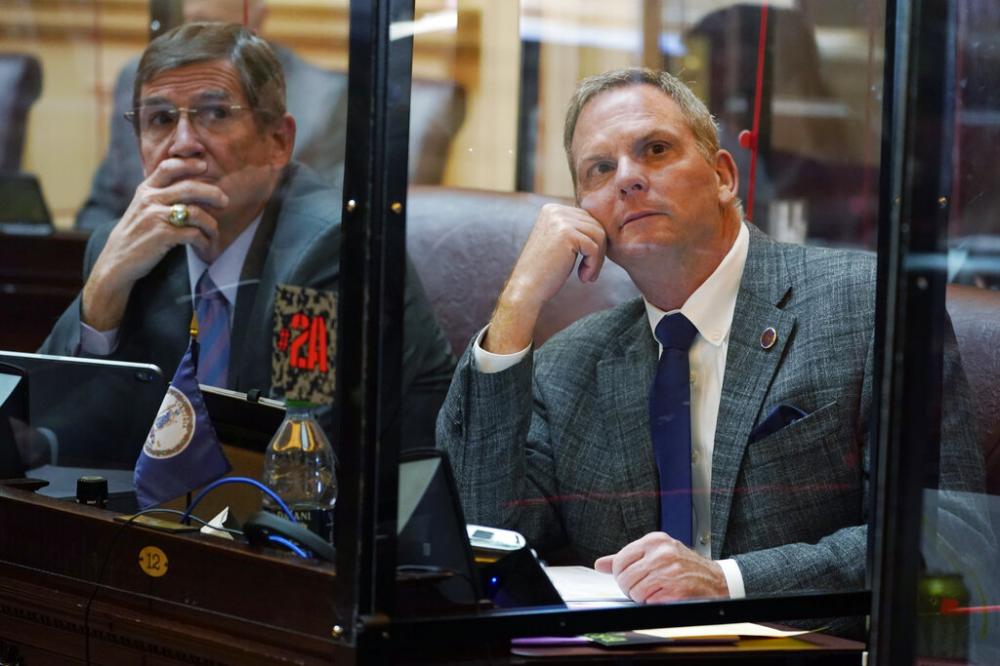 Virginia State Sen. Bill DeSteph, R-Virginia Beach, right, along with Sen. John Cosgrove, R-Chesapeake, left, look at the vote tally board during the Senate session at the Capitol Thursday Jan. 27, 2022, in Richmond, Va.  (Source:AP Photo/Steve Helber)