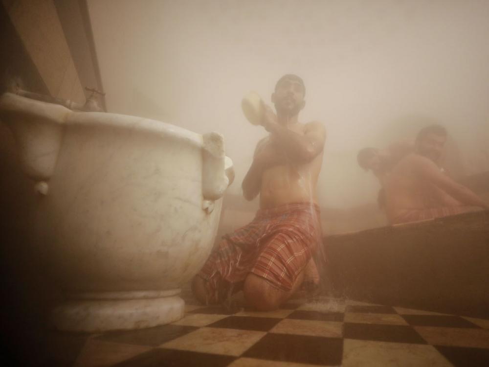At Hammam Bakri in Damascus' Old City, Syrian men wrapped in towels from the waist down lie down on a scalding marble floor. Masseurs vigorously scrub their skin with a soap-soaked loofah and wash them down with hot water.