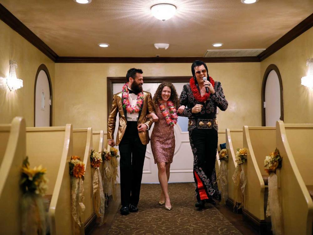 One chapel last weekend had its Elvis impersonator change instead into a leather jacket, jeans and a fedora for a "rock 'n' roll" themed ceremony, the Review-Journal reported.