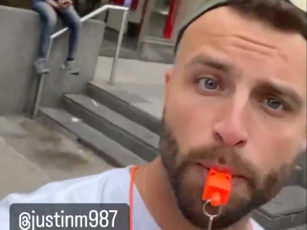 The video shows Dufour whistling while behind him a street preacher attempts to make his way through familiar talking points used by adherents of so-called "conversion therapy," a sham practice that claims to "cure" non-heterosexuality, supposedly by addressing deep-seated psychological wounds.
