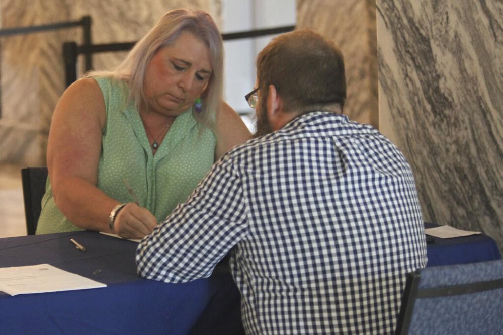 Kansas state Rep. Stephanie Byers, left, D-Wichita, fills out paperwork for Bryan Caskey, state elections director, to withdraw as a candidate for reelection.