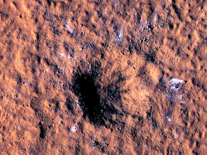 The larger of the two struck last December some 2,200 miles (3,500 kilometers) from InSight, creating a crater roughly 70 feet (21 meters) deep. The orbiter's cameras showed debris hurled up to 25 miles (40 kilometers) from the impact, as well as white patches of ice around the crater, the most frozen water observed at such low latitudes, Posiolova said.