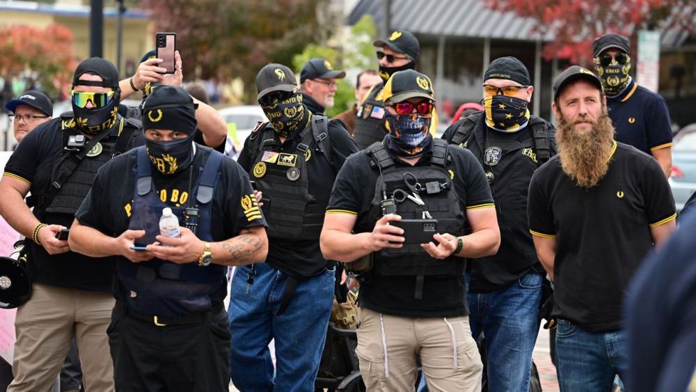 Police on the scene say around 16 Proud Boys turned up, many in bulletproof vests. They were joined by pro-confederate protesters who showed up along with other people holding signs with Bible verses on them.