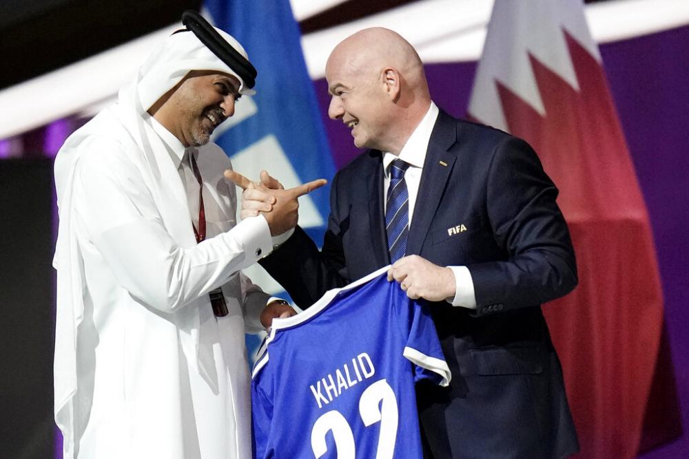 Prime Minister of the State of Qatar, Khalid Bin Khalifa Bin Abdulaziz Al Thani, left, receives a gift from FIFA President Gianni Infantino during the FIFA congress at the Doha Exhibition and Convention Center in Doha, Qatar.  (Source:AP Photo/Hassan Ammar, File)