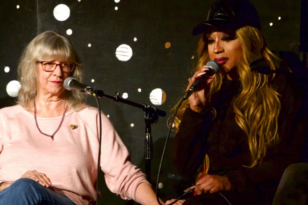 Lauren Mathers, director of Sandhills Pride, left, comforts drag queen Naomi Dix as she tears up while recounting the threats she received leading up to a recent drag performance while speaking on a panel with LGBTQ community leaders in Durham, N.C., on Thursday, Dec. 8, 2022.  (Source:AP Photo/Hannah Schoenbaum)