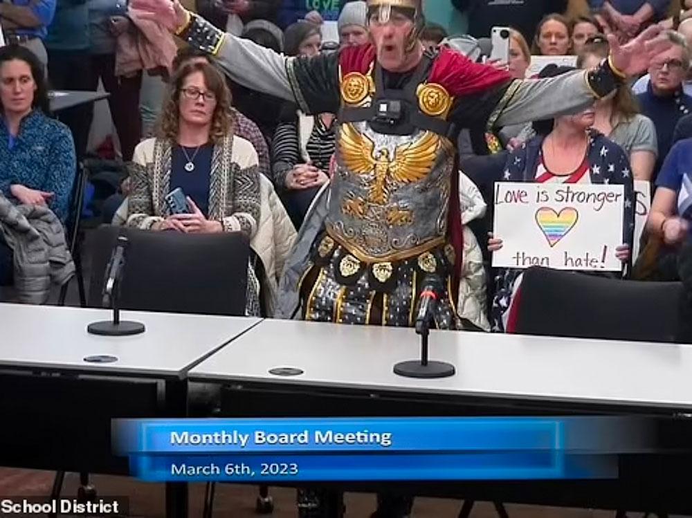 A New Hampshire man showed up a school board meeting in Concord, New Hampshire dressed as "Julius Caesar" to protest the the attire of a LGBTQ+ teacher allowed by the school, reports the Daily Mail."Michael Guglielmo, called for suspension of the superintendent and principal for allowing an art teacher who identifies with the LGBTQ+ community to teach," the tabloid reports.