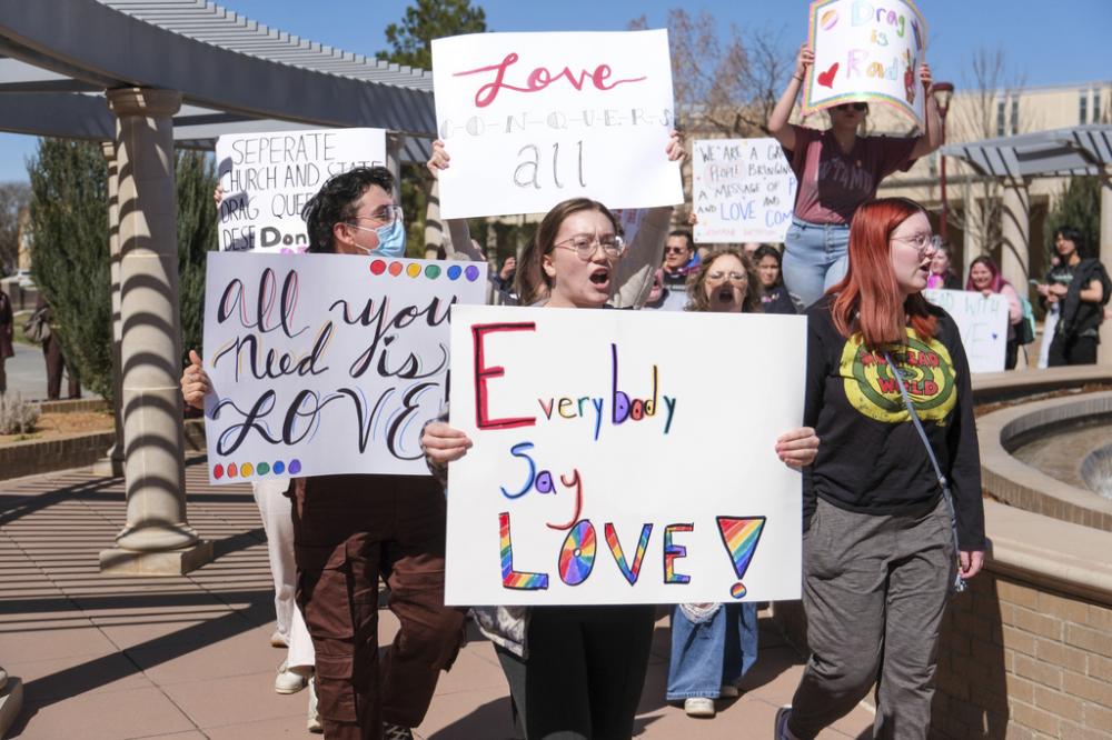 Dozens of students gathered for the protests for a second day at West Texas A&M University, located in Canyon, just south of Amarillo. The students have been waving gay pride flags and holding signs that included the sayings "Women for Drag," "Drag is Rad" and "Everybody Say Love."