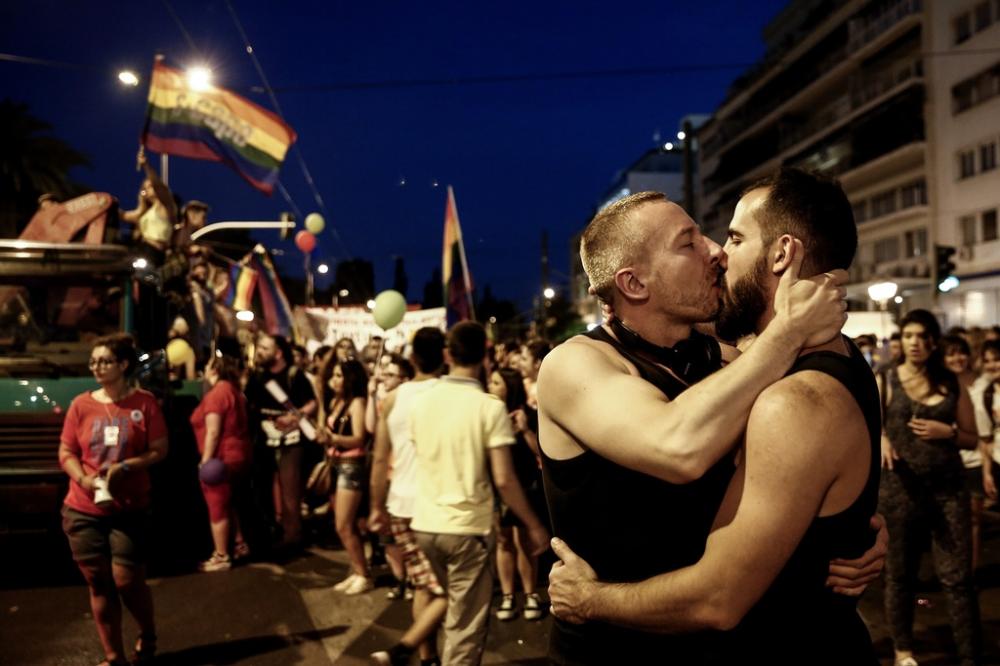 Two men kiss during an annual Gay Pride rally in Athens, Greece, Saturday, June 13, 2015.