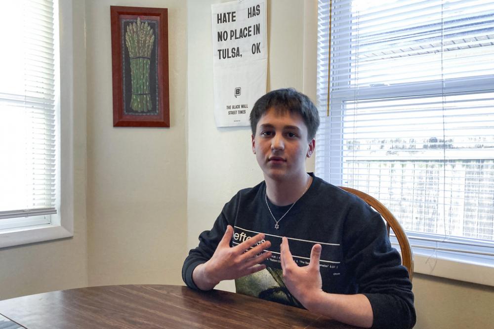 Al-Stone Gebhardt gestures while speaking at his home on Friday, March 3, 2023, in Tulsa, Okla.