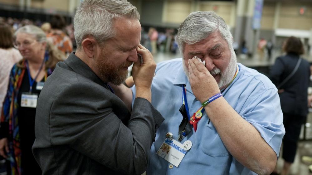 David Oliver, left, and David Meredith wipe away tears after an approval vote at the United Methodist Church General Conference Wednesday, May 1, 2024, in Charlotte, N.C.   (Source:AP Photo/Chris Carlson)