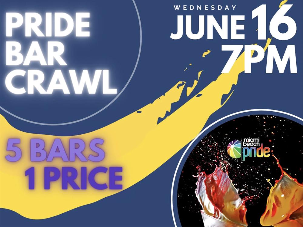 Miami Beach Pride along with your favorite gay bars in South Beach invites you to our Pride Bar Crawl on Wednesday, June 16 starting at 7pm. Purchase one ticket to enter the crawl and get one free drink at each bar. Yup, that's five free drinks for just $25 dollars. But that's not all! Additional food discounts at select bars for all ticket holders will be provided and the chance to enter to win our grand prize which includes Hotels stays, Dinners, Bars Tabs, and VIP Bottle Service at each of our neighborhood bars for a value of over 1200 dollars! Tickets available on Eventbrite